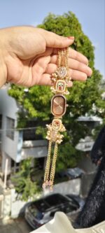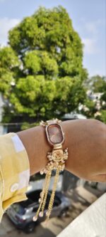 Elevate your look with this elegant rose gold kundan watch bracelet, beautifully handcrafted with soft-toned embellishments, pearls, and delicate floral detailing. Designed as a perfect fusion of jewellery and timepiece, it adds a graceful, statement touch to your ensemble.